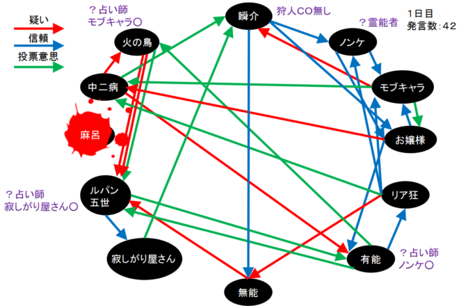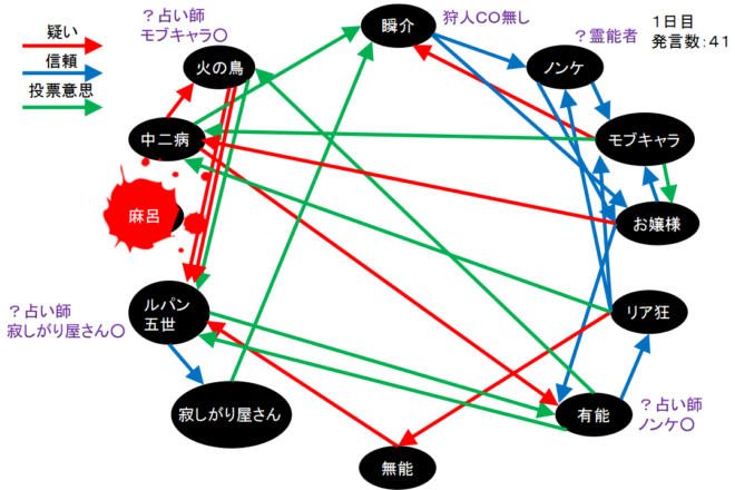 俺は真面目に前回のゲームにおける1日目の投票を観察している。赤い四角が火の鳥の投票。青い四角が火の鳥へ投票した者です。