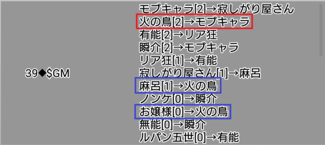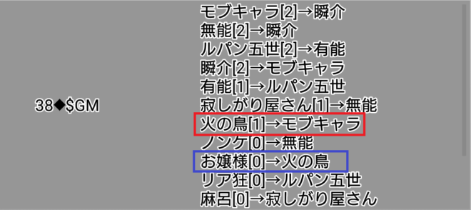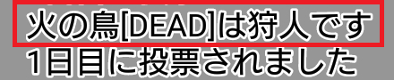 瞬介「火の鳥の役職は狩人だった。火の鳥がした投票の順番は『モブキャラ(妖狐)→モブキャラ(妖狐)→無能(人狼)』だ。投票者は1回目『お嬢様』、2回目は『お嬢様&麻呂』、3回目は『嬢様&寂しがり屋さん&無能』の投票で吊られてしまったんだ」