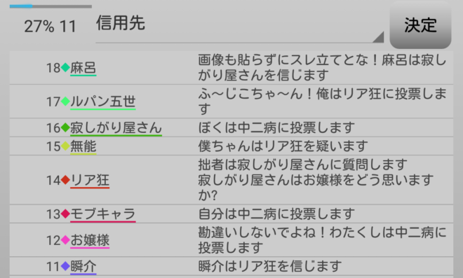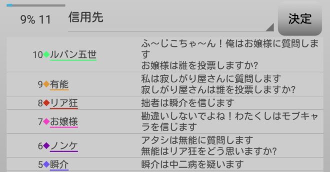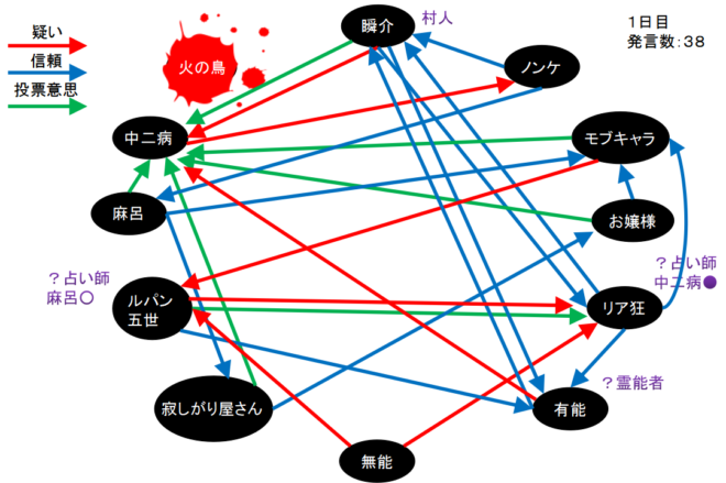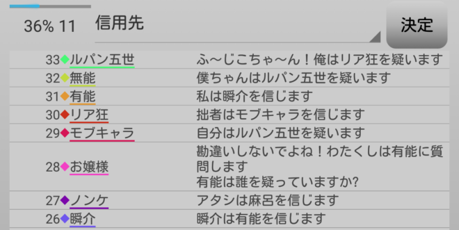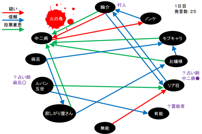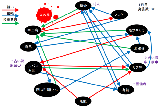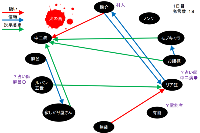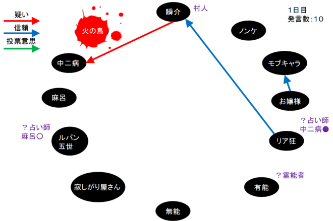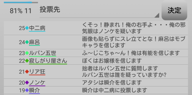瞬介「潜伏人狼も妖狐も中二病投票に合わせてきたな。人狼を1匹吊れた(?)のは良いけど果たして妖狐は見つかるのかどうか。吊り回数があと4回なのでルパン狂として無視すれば吊りと呪殺で足りるのか。問題は次に真占い師が●を引き当てた時に村人が最後の日まで自制できるかだな」