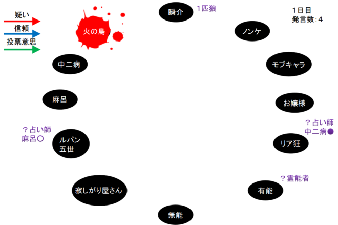 瞬介「リア狂が●を引いたか。リア狂は上手いこと人狼を引き当てた真占い師として考えてしまっても良いんじゃないかな?そして有能が真霊能者か。これは1匹狼になるよりも仲間と協力した方が勝てるかもしれないな」