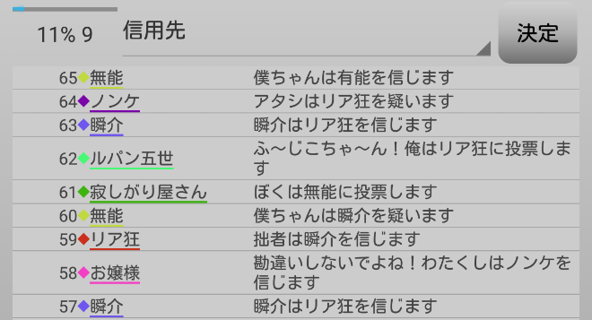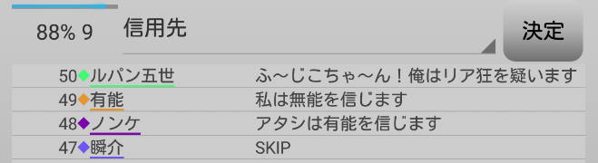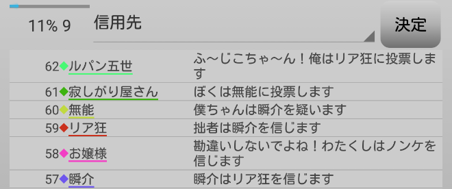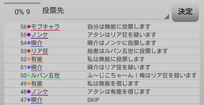 次が最後の発言だ。ここでリア狂へ3回目の信頼発言をするのも悪くはない、それが無難だとは思えるけど、リア狂の対抗であるルパンへ投票宣言を飛ばしてみるのはどうだろうか?そうすることによりグレー吊りを恐れた人外が狂人吊りを望んでルパン投票へと動くかもしれないし、ルパンの対抗であるリア狂からは信頼されるだろう。ただ本当にルパン(おそらく狂人占い師)へ投票して吊りになってしまったらまずいか?ルパンへ投票宣言をして俺はソッと他のプレイヤーへと票を動かす。すると真占い師のリア狂を刺激して占い先が俺になってしまうだろうか。俺はノンケにも投票宣言を飛ばしていたな?では!『ルパンへ投票宣言』をしたのちにノンケへ投票だ。
