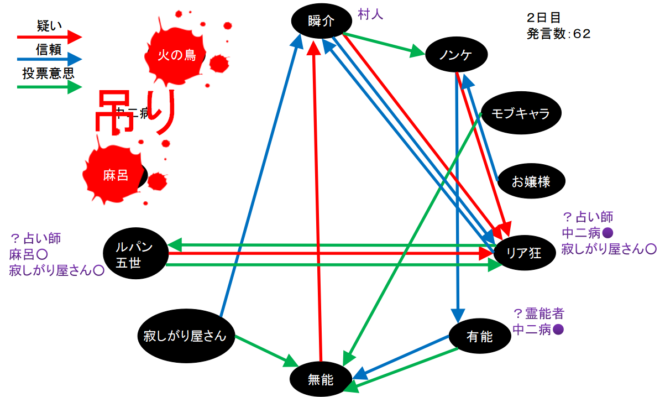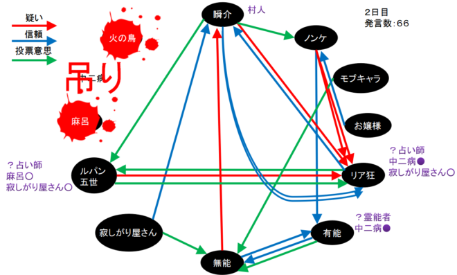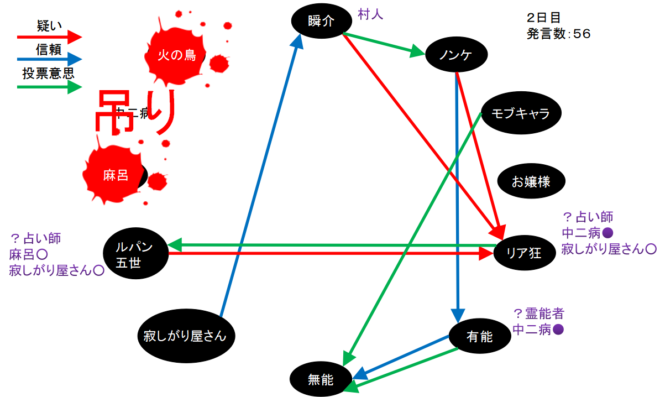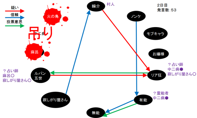 瞬介「リア狂の占いと有能の霊能結果がつながったので真は確定したろう。そして噛みは麻呂か。吊り回数は4回もあるけど油断していると真占い師が噛まれて負けてしまうかもしれない」