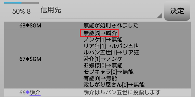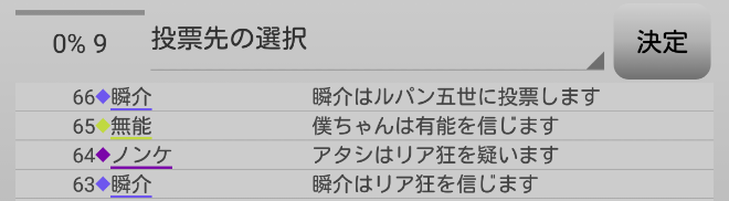 瞬介「狂人のルパンを吊ってしまうとまずいから、実際の投票はノンケへとする。さて投票の結果はどうなる!?」