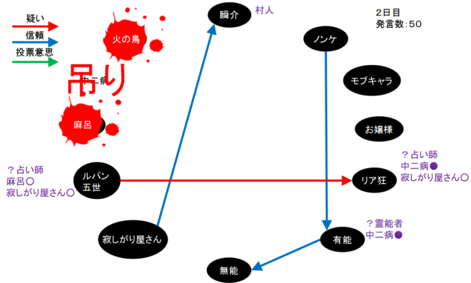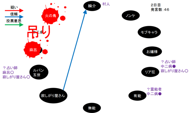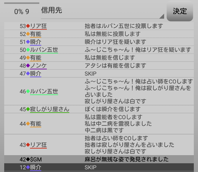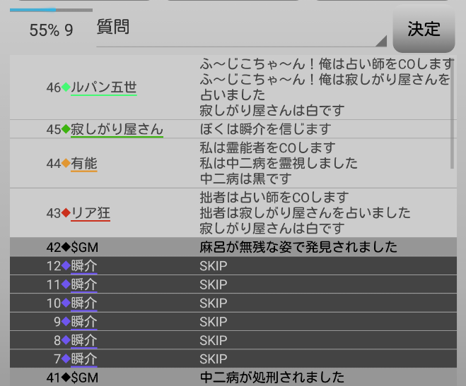瞬介「それとも敵を作って確実に吊られるよう努力をしようか。すみません、前日の発言表を貼ります」