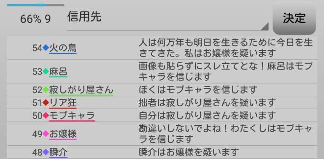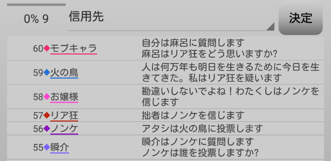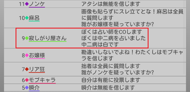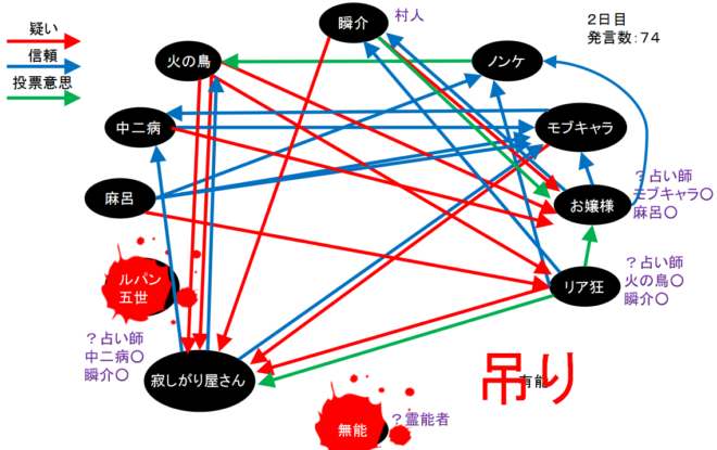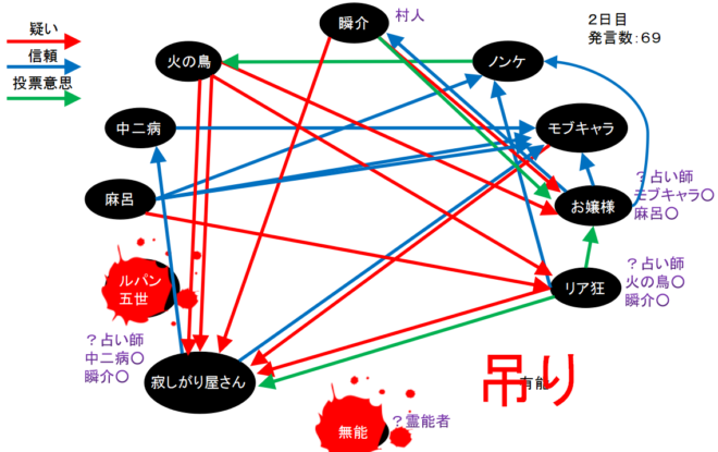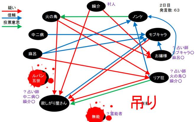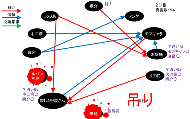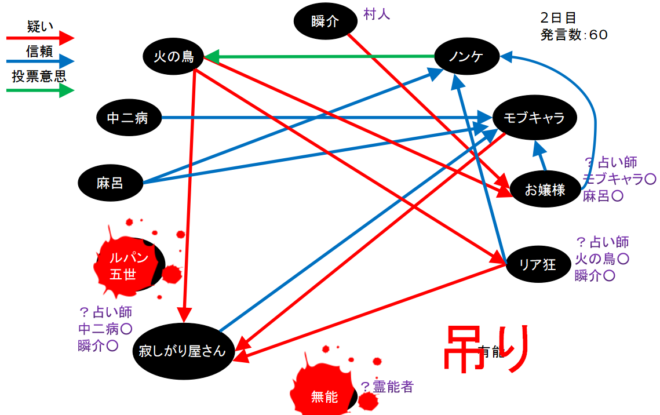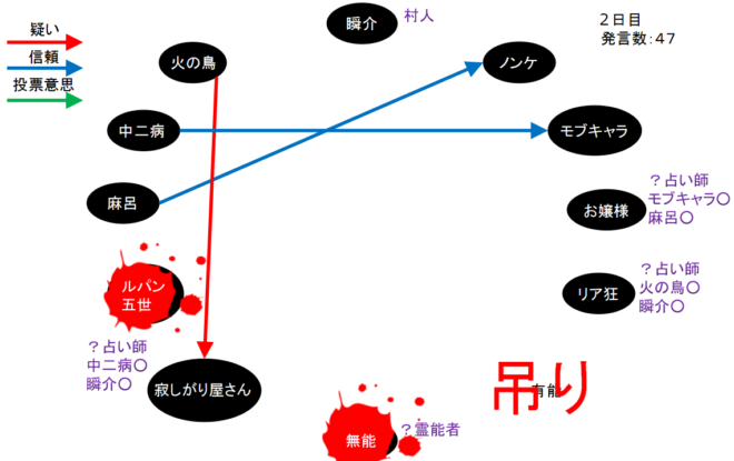火の鳥が2回も寂しがり屋さんを疑っている。やつは寂しがり屋さん真だと気づいた人狼か?するとリア狂の『火の鳥○』とお嬢様の『モブキャラ○、麻呂○』で『狂-狐』に気づいたことになるんだろうけど、モブキャラか麻呂が●ってことなのかな?わからない(笑)。