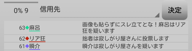 瞬介「リア狂から信頼された。お嬢様投票を評価されたのか。うーん、誰からも宣言をされていない『リア狂へ投票宣言』をしよう。もしかしたらグレー吊りに乗らず人外が便乗するかもしれない」