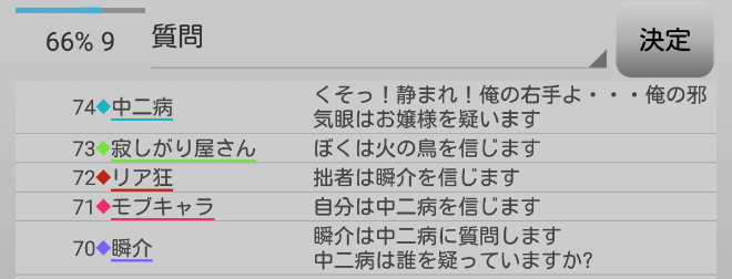 瞬介「次は寂しがり屋さんへ投票宣言を飛ばしてみようか。いや、リア狂占い師へ飛ばしてみよう。何の意味があるのかは分からないけど、他にやることも無いんだ(泣)。いやまてよ?中二病が誰にも疑い発言をしていないな。ノンケも同様に潜伏ぎみだが奴は吊られるから放置で良いだろう。『中二病は誰を疑っていますか?』」