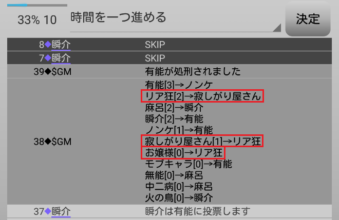 瞬介「お嬢様に赤矢印を飛ばした順番だが、まずリア狂(?占い師)とモブキャラが疑い、その後に有能、次に寂しがり屋さん(?占い師)、最後に無能となっている。協調性の高い彼女がグレー村人からも疑われることなんて今まで無かったはずだ。ゲームが終了するまでには原因を知りたいな」