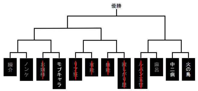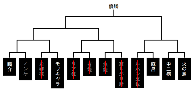 瞬介「『寂しがり屋さん●&中二病●』の可能性は高い。今のところ気になるのはこのくらいかな。そんじゃあトーナメント表を確認しようか」