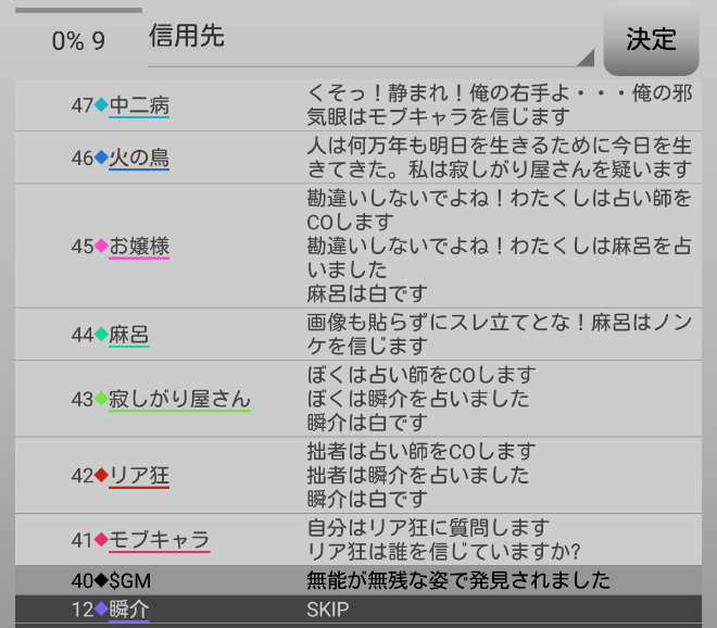 瞬介「ノンケの遺言は火の鳥投票か。そんで占い師2人はノンケに信頼を寄せていると。火の鳥が占い師に疑い発言を飛ばしまくっていて頑張っているな。俺も見習ってガンガン役職者を揺さぶろう。『寂しがり屋さんを疑っています!』」