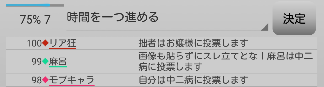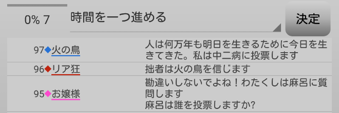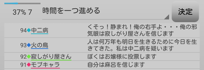 これでお嬢様に3票、中二病に3票となったか。お嬢様が人外から狙われている真と見えてしまうな。お嬢様が中二病へ投票して4票となり今日は中二病吊りかな。お嬢様が狂人ならば●誤爆をした中二病の代わりに吊られてしまえと対抗へ投票するのだろうか。今回も投票が読めない。議論はこれで終わり。投票タイムになります。さて結果は?
