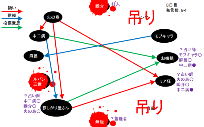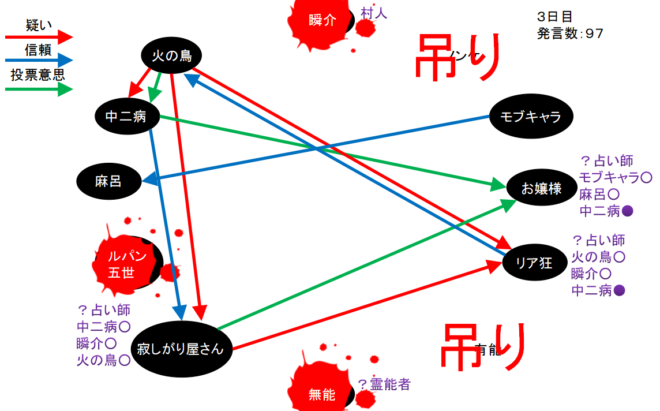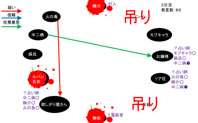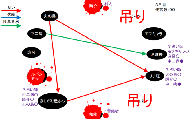 俺は『真』-『狂』-『狐』の可能性を疑っている。棒線は占い師達の対抗投票。赤い四角は吊られたノンケに投票した者となっています。青い四角はノンケの遺言であるモブキャラ投票です。