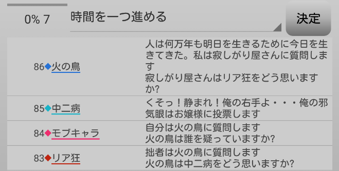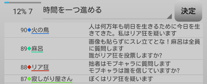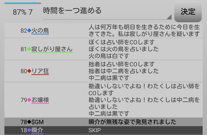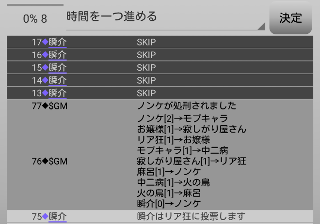 瞬介「必ずしも完全グレーへ投票が集中するわけではないのか。ノンケが人狼であり、投票しなかった者が人狼だと推理できるのかな?無理か(泣)。てっきり潜伏人狼が2匹で『真』-『狂』-『狐』かなと思ったんだけどなあ」
