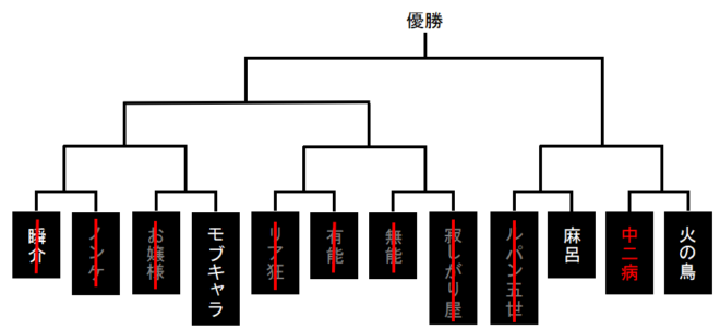 中二病がノータイムでお嬢様へ投票宣言をしたな。リア狂の方へはしなかったわけだ。リア狂が占った火の鳥○が人狼への誤爆なのでリア狂を狂人占い師だとみたのか、あるいは逆でお嬢様を妖狐とみたのか。人狼に妖狐と狂人の区別はつかないだろうから、前者である火の鳥人狼の可能性があるといったところか。次にいきます。いや、すいません、トーナメント表を貼らせてください。