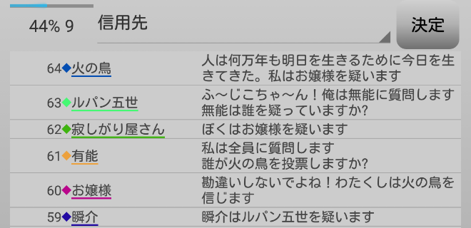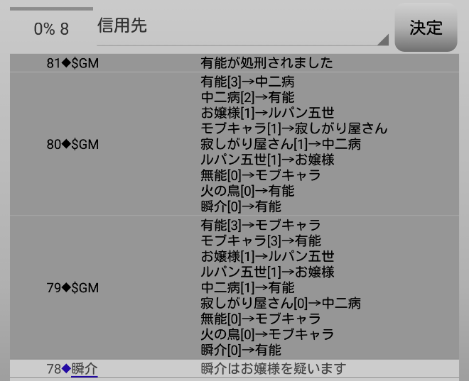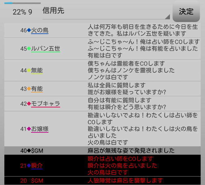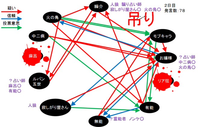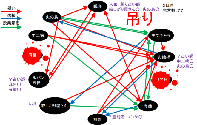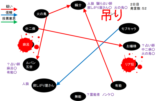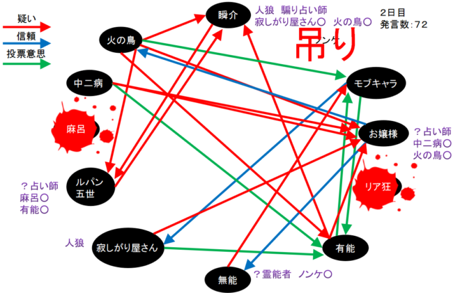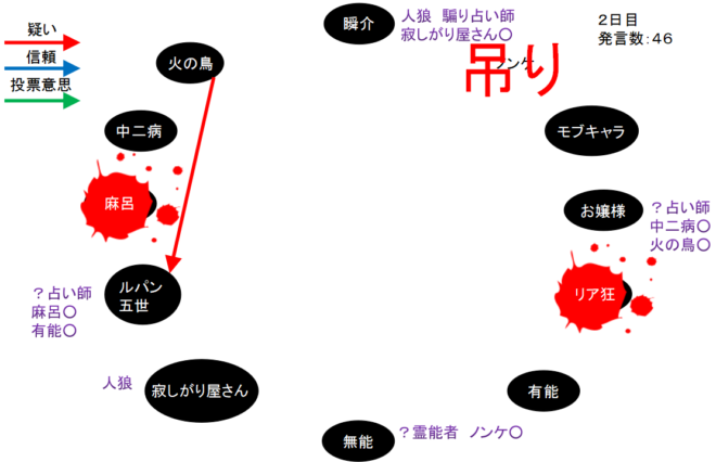 瞬介「有能の野郎が俺を疑っている。奴には○がついたので噛んでやってもいいな。そうすると俺が疑われるか。ええと?火の鳥が占い師を疑っているなあ。麻呂噛みから俺を疑うのは分かるけどルパンを疑っているのはなぜだ」