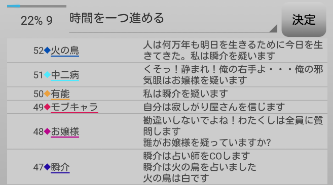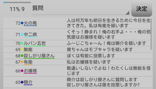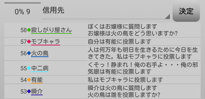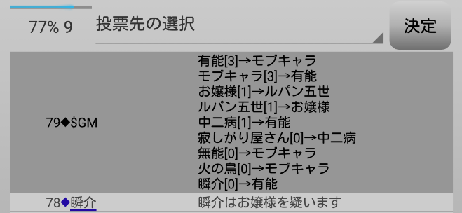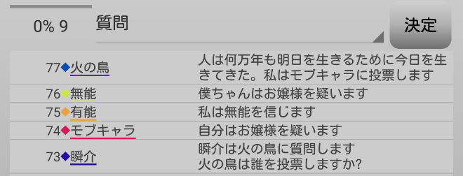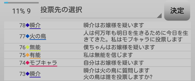 瞬介「ダメ押しに誰かから投票宣言を引きだそう。火の鳥が有能を疑いだしたので有能投票へ動くかもしれない。『火の鳥は誰に投票をしますか?』」