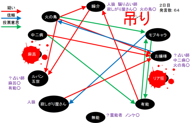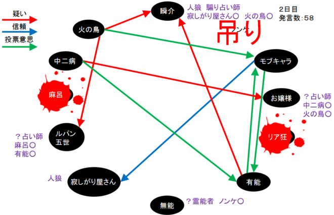 瞬介「俺の占い結果がお嬢様の火の鳥○と重なったか。グレーはモブキャラ一人。そして火の鳥は噛み候補となり、妖狐である可能性は低くなったわけだ。麻呂噛みで寂しがり屋さんをピンチに追い込んでしまったね。明日は●出しが必須だろう。『火の鳥を占って○でした!』」