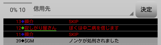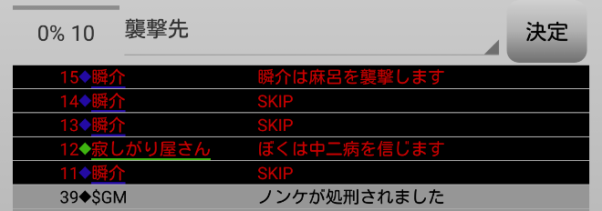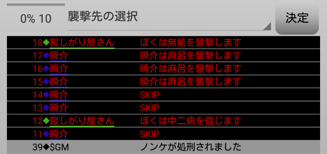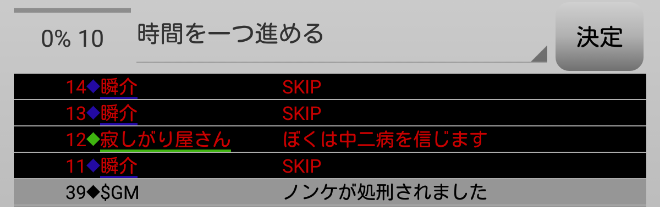 瞬介「中二病がトチ狂って有能投票へ動いたな。完グレのモブキャラが有能投票に動いて有能が2票集めている。上手いこと有能吊りになってグレーのモブキャラが残らないかな(笑)。そうすれば明日に全員の占い師がモブキャラを占って寂しがり屋さんへの●出しを阻止できるかもしれない」