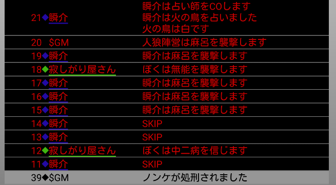 瞬介「寂しがり屋さんからは何の反応も無い(笑)。俺に任せてくれるということかな?やっぱりグレーが少ないので1日目に2人で占い師のCO待機をしたかったなあ。負けたら俺の戦犯です。では、『麻呂襲撃&火の鳥占い』でいこう」