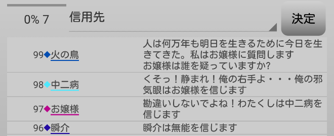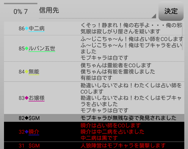 瞬介「よし!狂人と真占い師の結果が同じモブキャラ○となった!ここで中二病●を出したら●吊りにならないか?無理かね?僕ちゃんの占い結果じゃ信じられない!?『中二病を占って●でした!』」