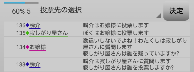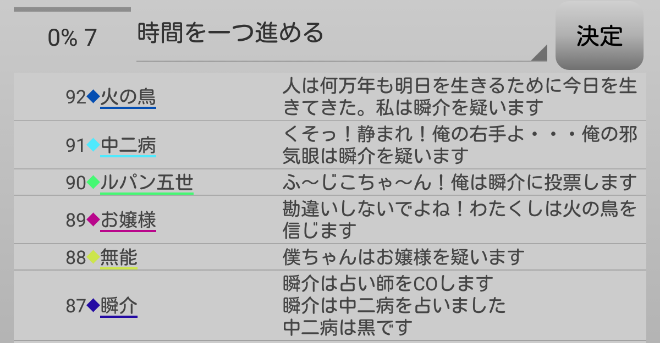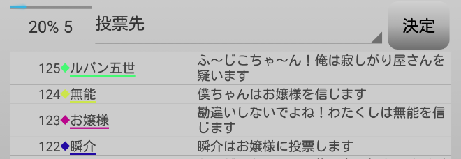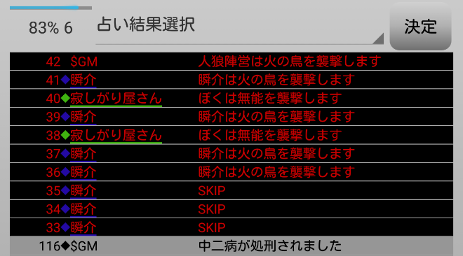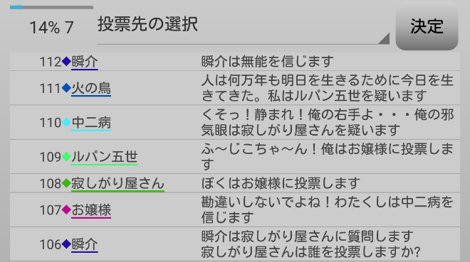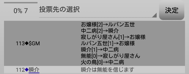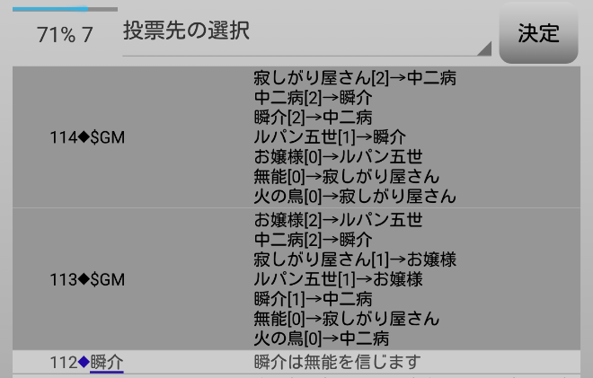 瞬介「くっそだめか。対抗と中二病からの投票で吊られるぞ。さすがに都合の良すぎる噛み先と占い先だったか(笑)。『中二病に投票します!』」