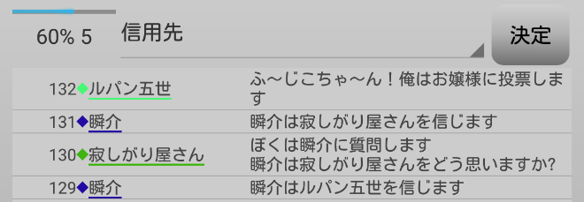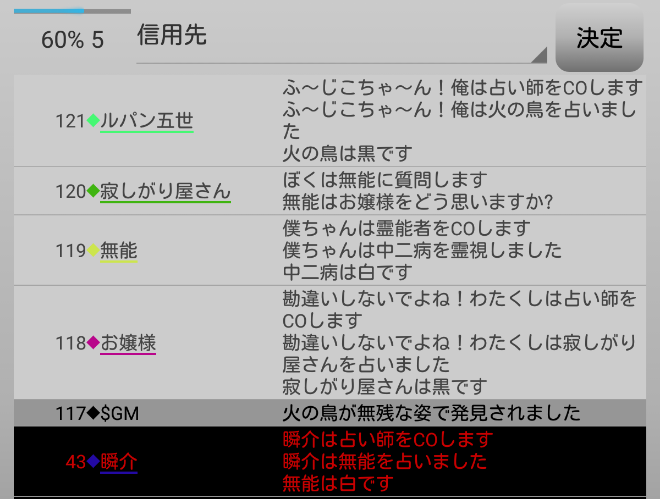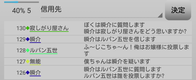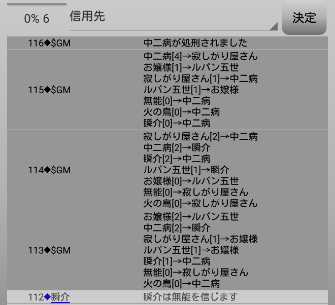 瞬介「まずいな。吊られるだろこれ。とりあえず真霊能者の無能が信頼を集めているみたいなので信頼をしておこう。『無能を信頼しています』」