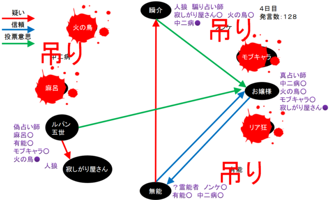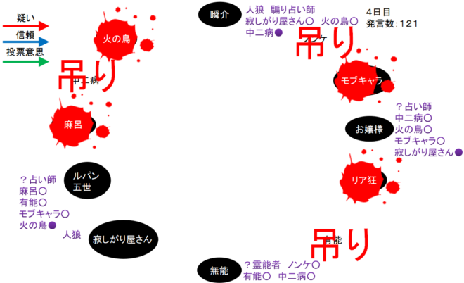 ただ明日は狂人がグレーモブキャラ占いで●を出す可能性がある。そこを狙ってモブキャラ噛みで破綻させる。そして破綻した狂人占い師で吊り回数を消費させるという方法もあるな。