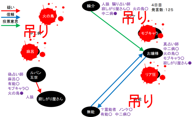 瞬介「俺は人外だとバレただろ(笑)。寂しがり屋さんもグレーに投票していないので真占い師からはマークされているに違いない。有能の投票が2回目に中二病へ動いているのは謎だな」