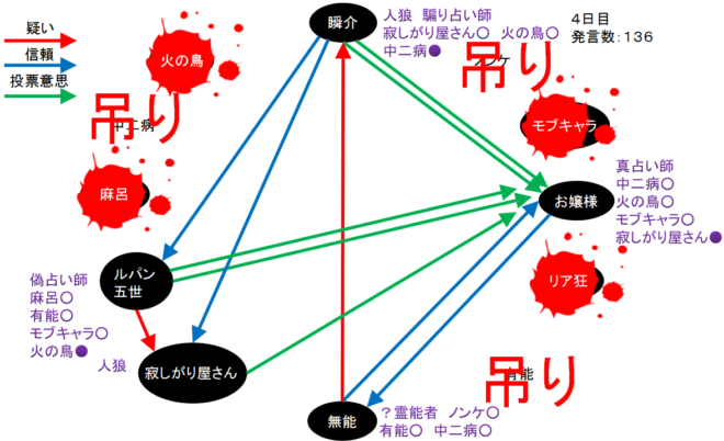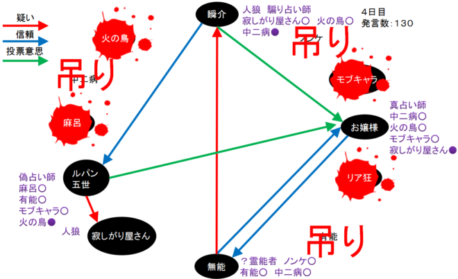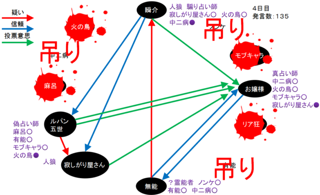 瞬介「おお!真霊能者の無能が中二病投票へ動いたぞ。そうだよなあ。まだ吊りの回数は3回もあるんだから真霊能者が生きているのならここで●吊りだよなあ」