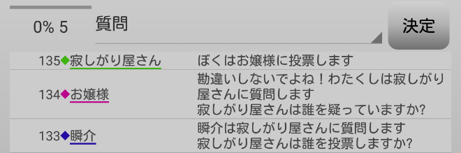 瞬介「AIは吊り先の嘘をつくかもしれないから寂しがり屋さんからも聞いておこう。『寂しがり屋さんは誰に投票しますか』?」
