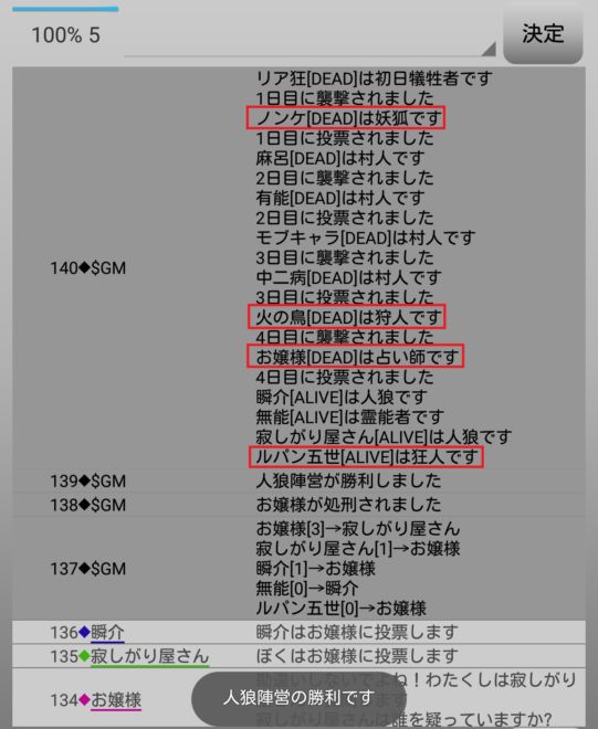 瞬介「よし勝った!火の鳥が狩人だったのか!最後に余裕をかまして無能を噛みにいったらGJ出されて負けていたな(笑)。そして妖狐は中二病ではなく1日目に吊られたノンケだったのか。ノンケとか、どういう経緯で吊られたのか思い出せないよ!無茶な勢いで突っ走ったけど運が良かった。無能が中二病●吊りにのってくれたのが勝因でしたね。有能だったらまずかったかも」