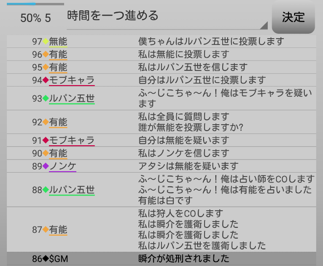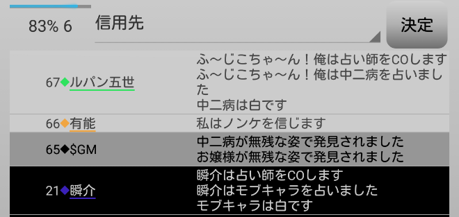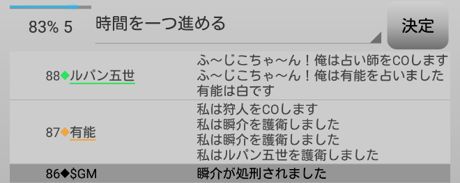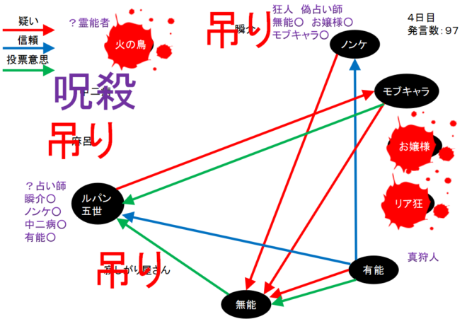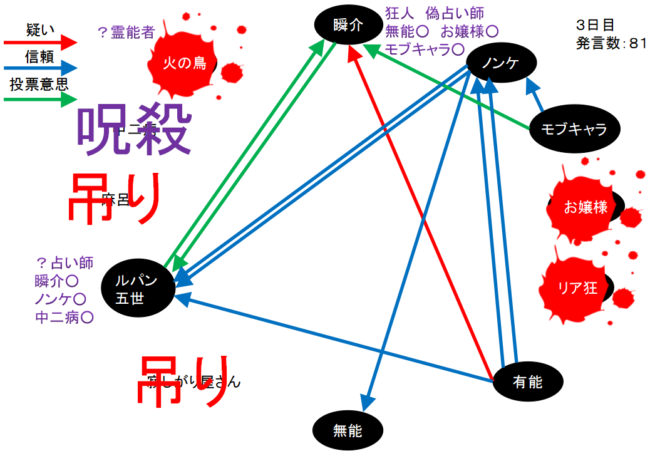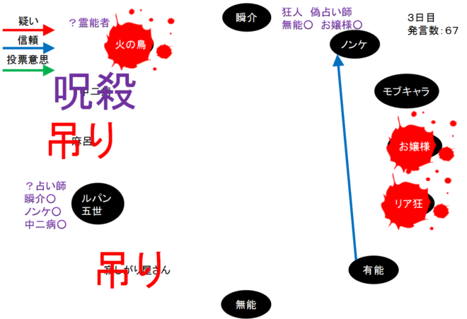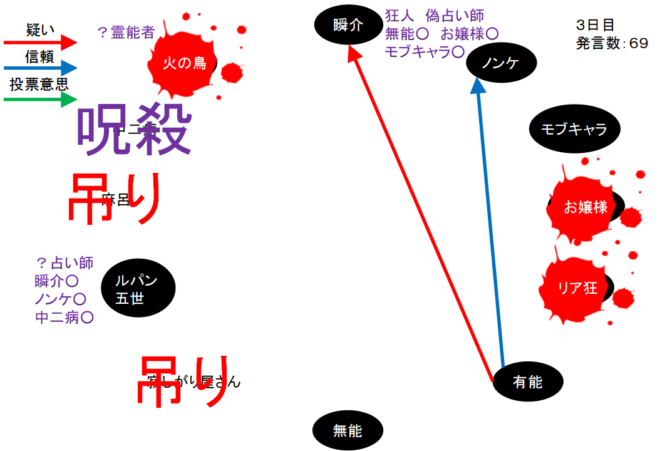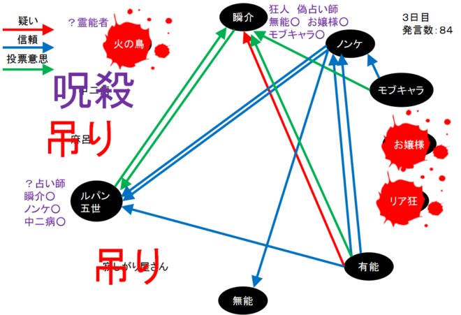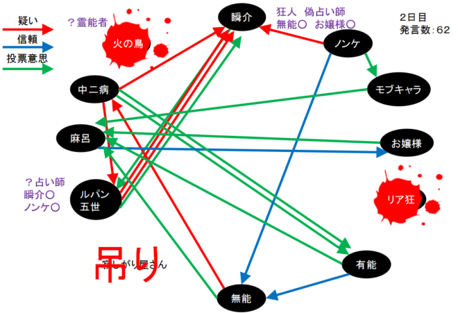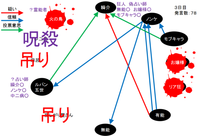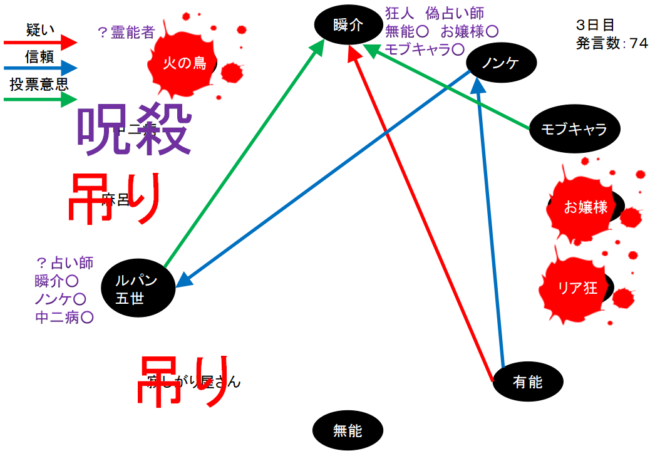 瞬介「自分としては有能が投票宣言を無視してフラフラと動いており気になる。だけど注視するべきは吊った者だろう。2日目の占いもルパンは寂しがり屋さんを吊ったノンケを占ったしな」