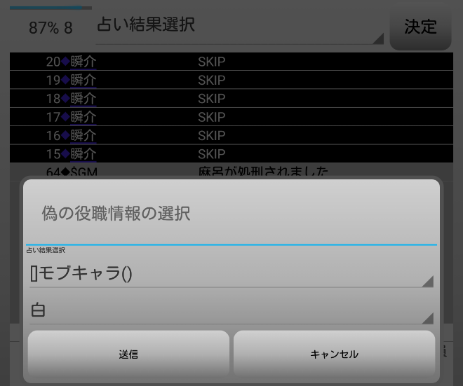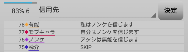 もしかしたら占い先は発言の少ない無能になるかもしれないな。ここで1日目無能占い○出しが吉とでるか?『スキップ』して次にいきます。