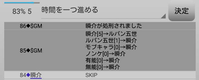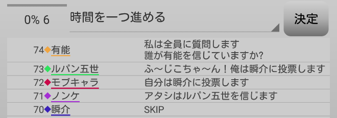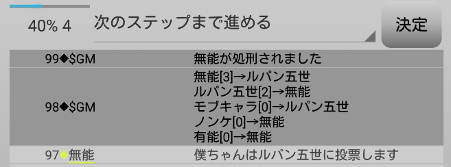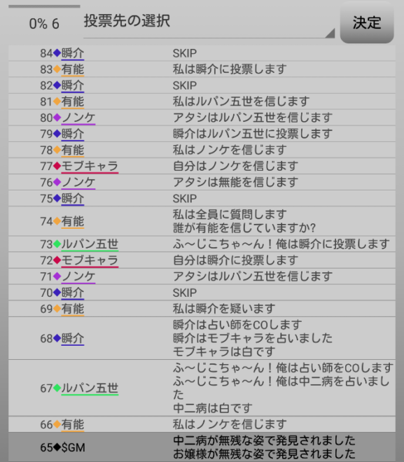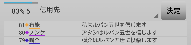 瞬介「皆から投票宣言が飛ぶと思ったらそうでもなかった。もしかしたらPPっぽく票が合うかもしれないから対抗へ投票宣言を飛ばしておこう。『ルパンに投票します!』」
