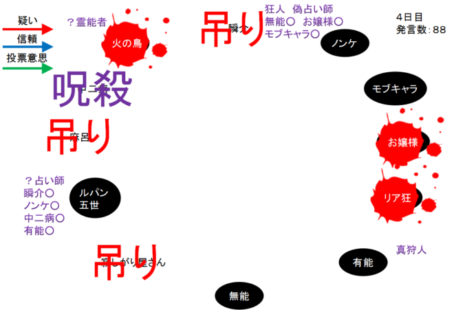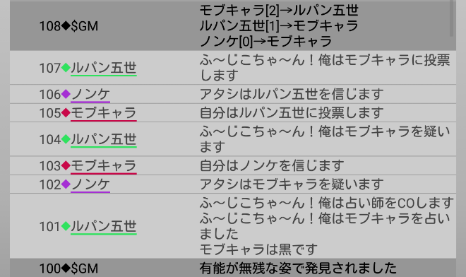 議論は以上です。モブキャラが●を出されて吊られました。というわけで結果は?