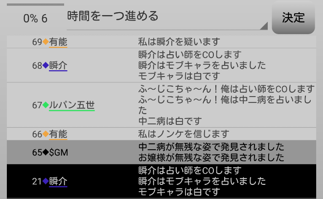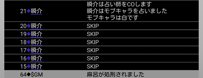 瞬介「真占い師と合わせるとなれば麻呂投票者の中から占い先を選ぶべきだろう。すると?グレーのモブキャラ一択になるのかな?」