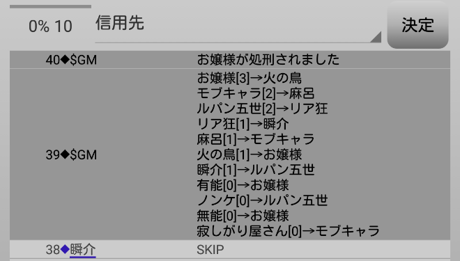 瞬介「俺とノンケとリア狂の3票でルパンを吊れるかもしれない。ここで真占い師を吊る意味はある!?リア狂が妖狐の場合はありかもしれないけどさ。ワンチャンス賭けてルパン投票をするか。しかし投票宣言はしないのだ。『スキップします!』」