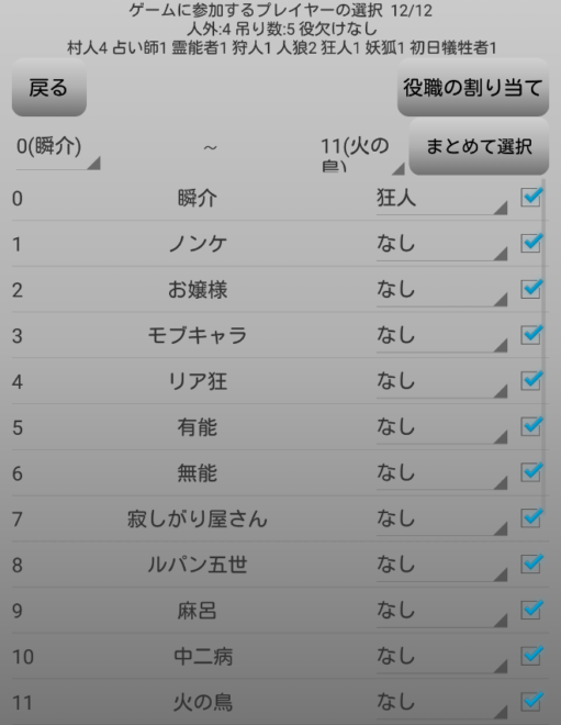 時間が無いので反省はこのくらいにしてゲームを開始しましょう。前回に引き続き役欠けなしの12人村で狂人を担当します。