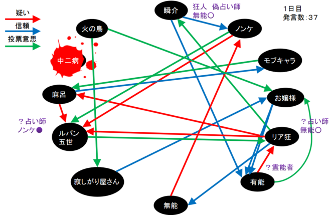 瞬介「んん!?人狼の真霊能者(有能)噛みが成功している。人狼は●のノンケと占い師にいるだろうから別にどうでもいいけど。それよりもなぜルパンは寂しがり屋さんを占ってリア狂は麻呂を占ったんだ?2人は投票で目立っていたっけ?」