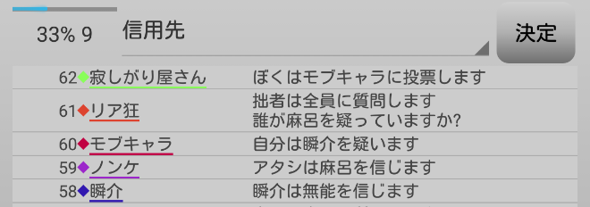 瞬介「村の方針はグレーモブキャラ吊りか。まあ妖狐を最優先で始末しなければいけないので当然の判断だろう。吊りは4回もあるからな(笑)。最後のグレーであるモブキャラを吊れば『俺、リア狂、ノンケ』を吊って終わりだ。俺たち人狼陣営としては阻止するために吊り回数を消費させたいところだな」