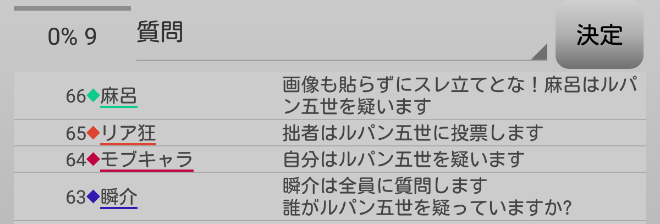 瞬介「議論はここで終わり。投票の時間になります。再投票によるルパン吊り、グレーモブキャラ残しへのわずかな可能性にかけてルパン投票だ」