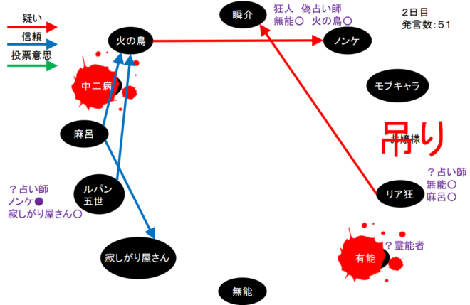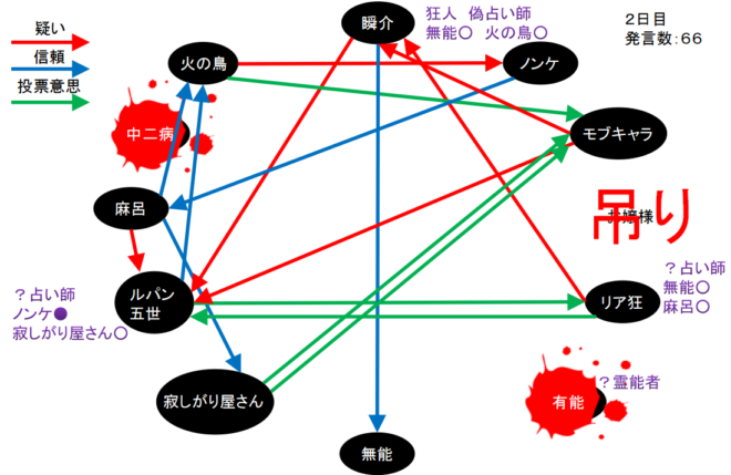 2日目占い先のグレーは『モブキャラ、寂しがり屋さん、麻呂、火の鳥』の4人。占い師が同じプレイヤーを占ったら2日目にして3人のグレーが残ってしまうのか。ゆえに火の鳥占いを嫌ったのかな?他に理由はあるかもしれないけどね。