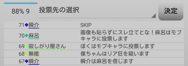 最後は『スキップ』だ。もしかしたら誰かが投票宣言で嘘をつくかも知れないし再投票でルパンを吊れるかもしれないから俺は宣言無しでルパン投票をしちゃおうか。