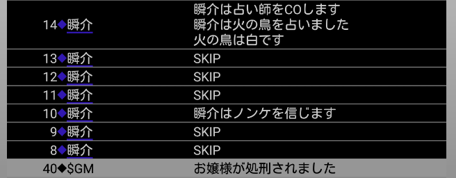 瞬介「火の鳥○で偽占い結果は作ったけど、ここからどうすれば勝てるんだろう。明日、人狼が霊能者噛みで狩人GJが出たら泣きっ面に蜂だな」