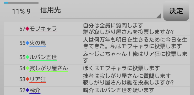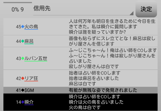3日目の朝に俺が偽●を出すというのはどうだろうか。別に偽●の者が吊られなくてもいい。吊られ役になればOKという●出しだ。そうすると4日目か5日目にリア狂が吊られてしまうか。悩んでばかりいても仕方がないので発言をしてゲームを進めよう。無能を信頼しています・・・火の鳥から誰を疑っているか質問が来ているな。『対抗占い師のルパンを疑っています!』。