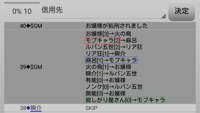 瞬介「麻呂と寂しがり屋さんは投票数2位だったモブキャラへ入れている。2位の者へ投票した奴も占い候補になるの?お嬢様投票者だと火の鳥一択になるから、3人が同じプレイヤーを占わないように外してきたとか?」