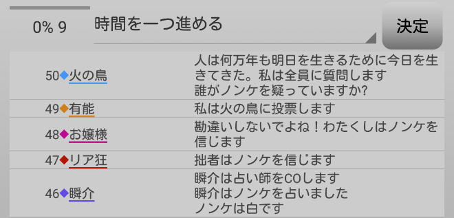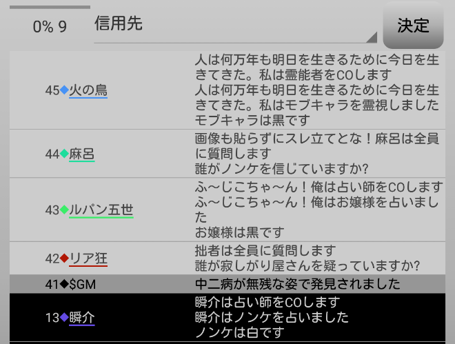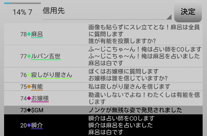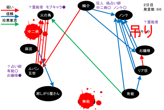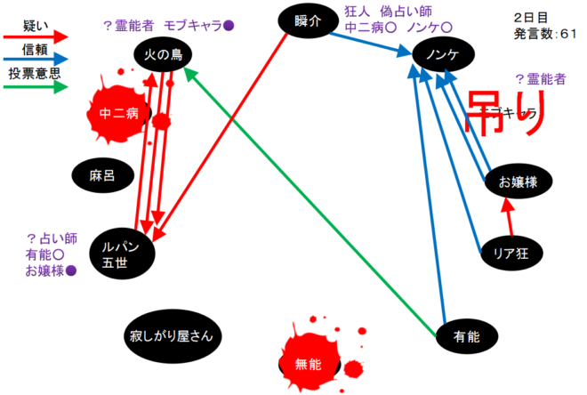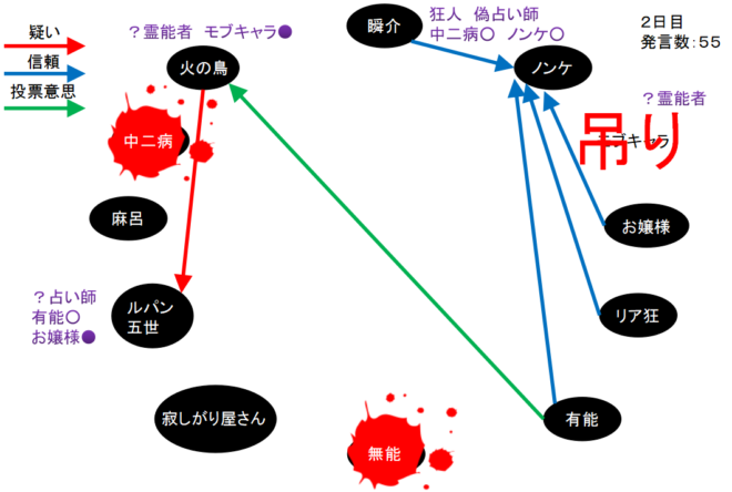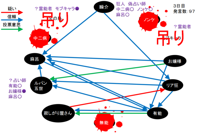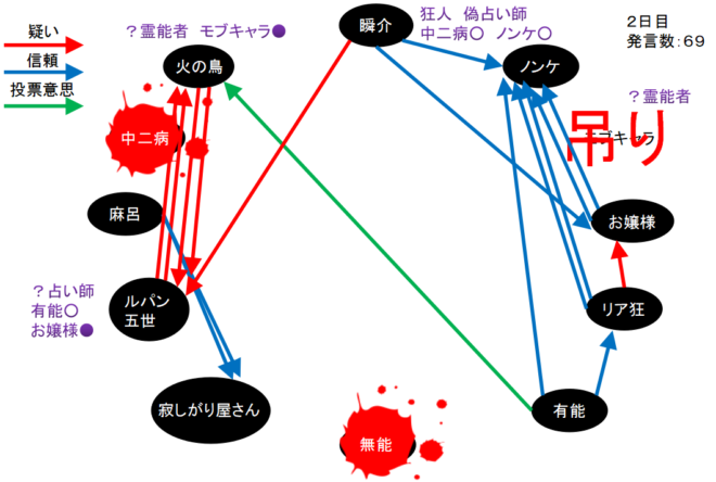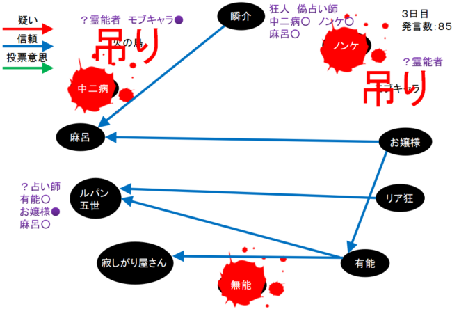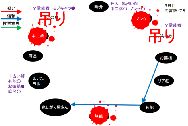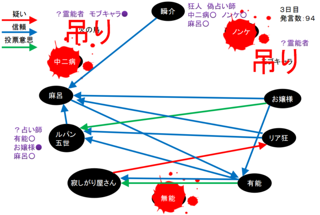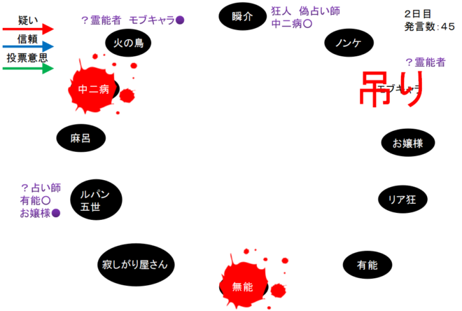 麻呂が信頼していたのは霊能者のモブキャラと俺が○を出した中二病だ。吊りを逃れようと議論を放棄しているようにも見えるがそれはノンケも同じだ。