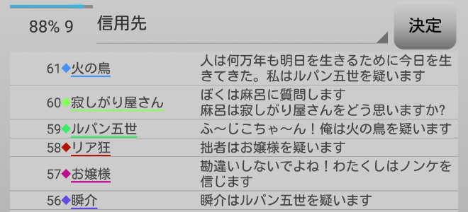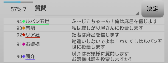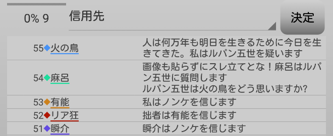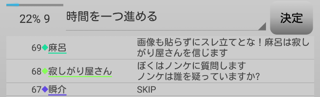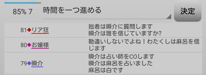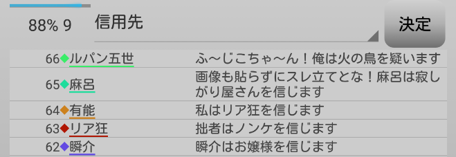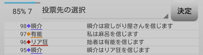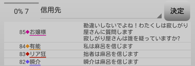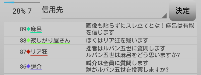 瞬介「リア狂から質問がきているな。ここはリア狂を信頼していると返答して仲間を増やしておくか。彼は小難しい性格をしていないので変に勘ぐったりしないだろう。いや、他のプレイヤーから不信に思われるな。○が2つある『麻呂を信頼します!』」