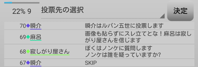 瞬介「次が最後の発言になる。対抗ルパンに投票宣言をして終わらせよう。『ルパンへ投票します!』」