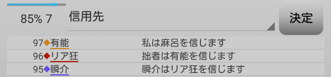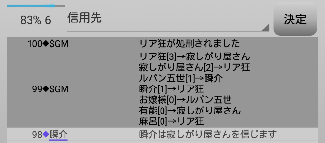瞬介「リア狂は『ルパン&有能』派へ流れそうだから、寂しがり屋さんへ信頼を飛ばしておいた。俺はリア狂を吊って寂しがり屋さんを残そう」